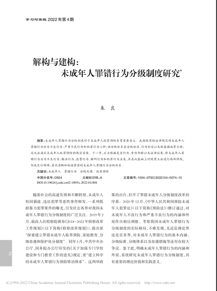 《学习与实践》2022年第4期刊发了我院朱良老师的文章《解构与建构: 未成年人罪错行为分级制度研究》。该文分为四个部分,深入阐释了我国未成年人分级制度的理论渊源、制度设置、现状反思和完善路径等问题。