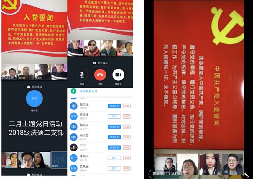 2018级全体党支部通过学习强国视频会议形式开展主题党日,在重温入党誓词、学习文件精神后,18级党支部全体成员结合自己的法学专业以及“停课不停学”展开了充分讨论。
