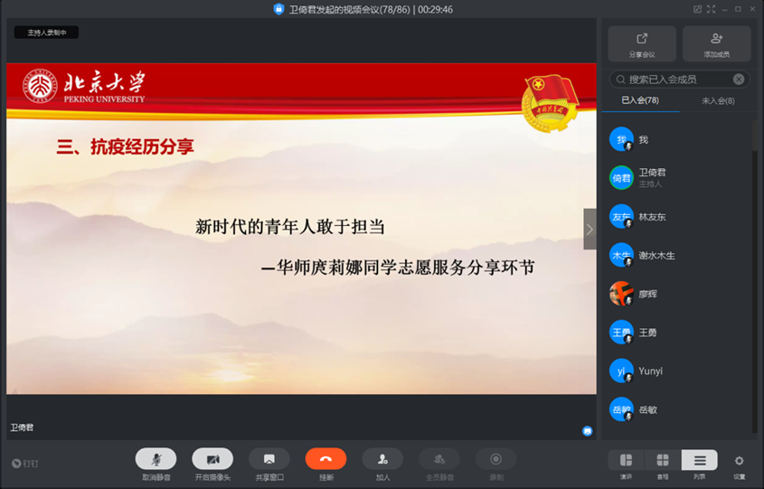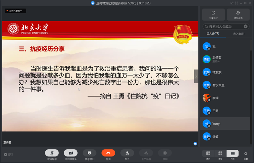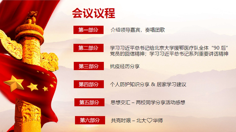 本次活动由北京大学国际法学院2019级2班团支书卫倚君主持,活动共分为五个环节:第一部分介绍领导嘉宾,奏唱团歌;第二部分学习习近平总书记给北京大学援鄂医疗队全体“90后”党员的回信精神;第三部分为抗疫经历分享;第四部分为个人防护知识分享及老师们对于居家学习的建议;第五部分为两校同学分享活动感想。