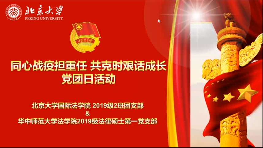 3月29日,我院2019级法律硕士第一党支部和北京大学国际法学院2019级2班团支部共同举办的“同心战疫担重任,共克时艰话成长”主题党团日活动举行。此次活动采用线上方式进行,会议深入学习了习近平总书记给北京大学援鄂医疗队全体“90后”党员的回信精神,并邀请到重庆市第一批血浆捐献者王勇讲述自己的抗疫经历。