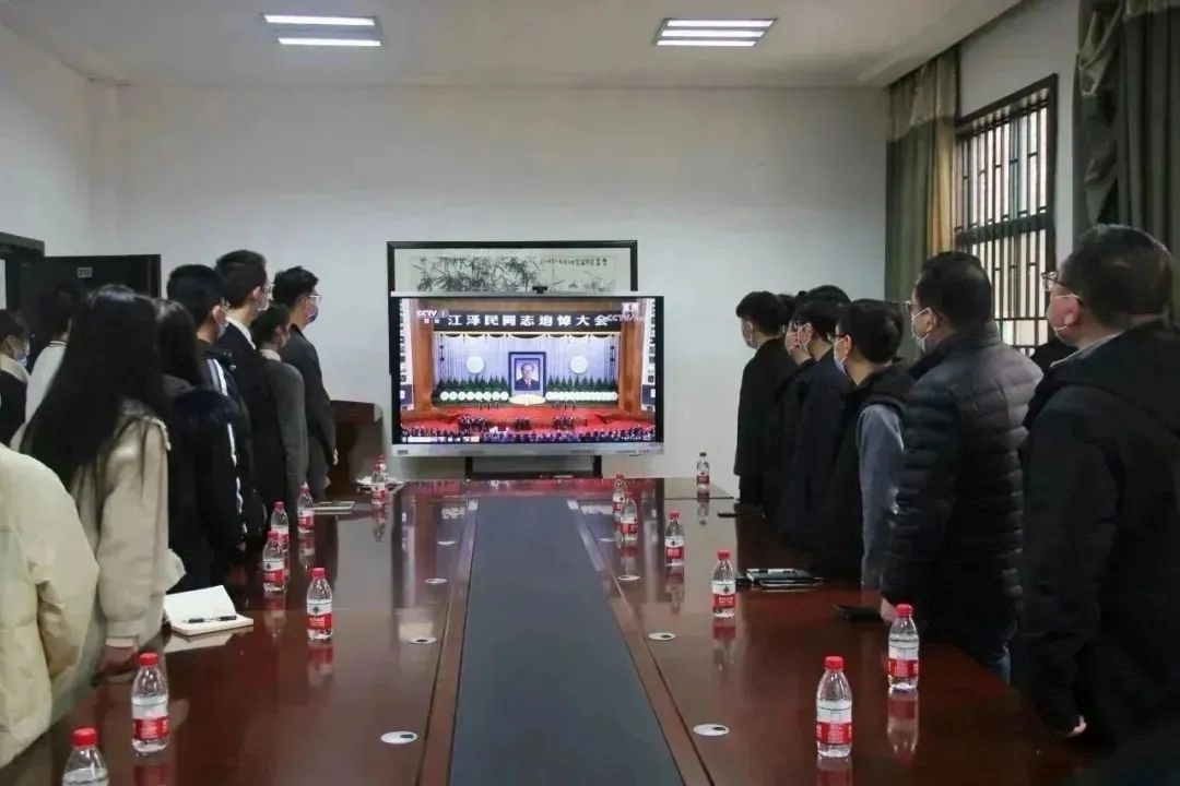法学院二楼会议室设置了集中观看会场,学院党委书记杨臣,院长丁文,副院长文杰、肖登辉,党委委员、教学秘书田栋,党务干事秦亚琼,团委书记、宣传干事张永基,团委副书记姜孝文和党员代表、学生代表怀着极其沉痛的心情,集中观看追悼大会,默哀3分钟,向江泽民同志三鞠躬,表达对江泽民同志逝世的沉痛哀思和深切缅怀。