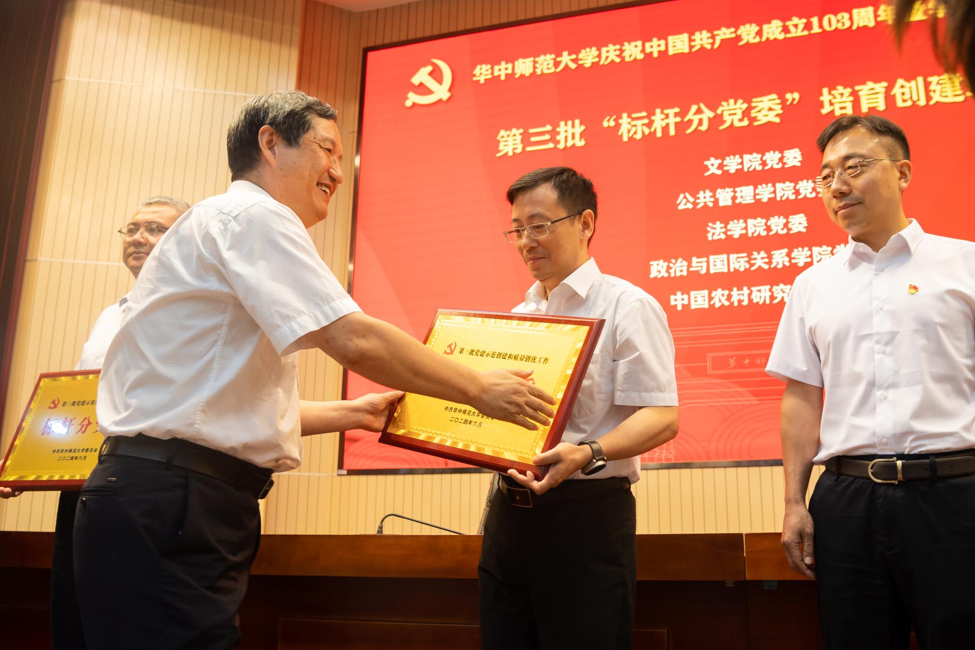 会上,学校对第三批党建“双创”工作培育创建单位进行授牌,并为第五届“支部好案例、书记好党课、党员好故事”展评活动获奖人颁奖。法学院党委入选学校第三批“标杆分党委”培育创建名单。