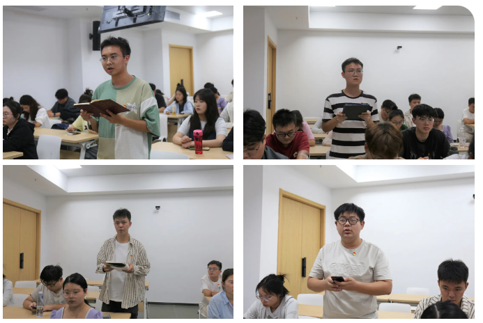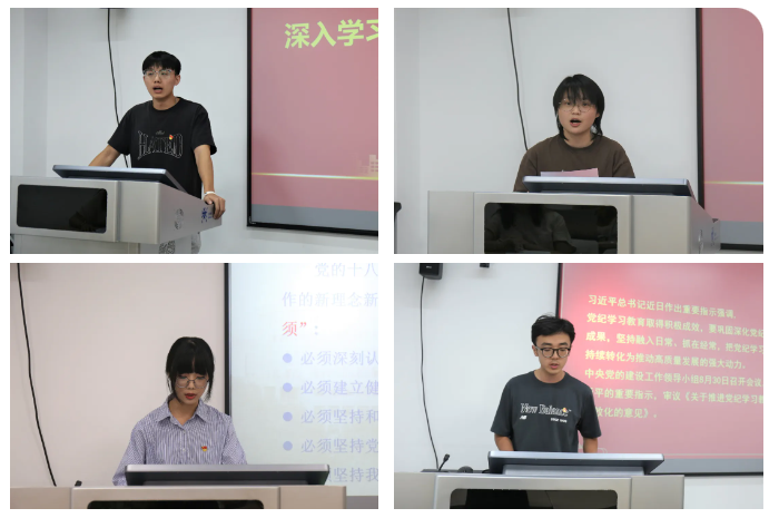 重温入党誓词之后,来自2024级与2023级的5位党员代表分别带领大家学习了本次主题党日的理论学习内容。肖博涵认为,作为新时代青年党员,要深刻领悟党的二十届三中全会精神,并将其贯彻于推动个人成长与学院发展的实际行动中。陈梓淇在领学全国教育大会精神时表示,作为一名法律专业的学生,我们应努力学习专业知识,提升法律素养,为法治中国建设贡献智慧与力量。蔡圆围绕“正确认识和对待宗教问题”这一主题,向各位党员同志们传达了法治宣传教育活动在宗教领域的重要性。刘乐康表示,我们学生党员应准确把握目标要求,逐章逐条学习《中国共产党纪律处分条例》,深入开展警示教育,更加自觉、更加坚定做到“两个维护”,为推动学院事业高质量发展提供坚强纪律保证。张麟琛在领学《中国共产党不合格党员组织处置办法》时表示,各位党员同志要严格遵守党的纪律和规矩,做到心中有党、心中有民、心中有责,努力做一名合格党员。