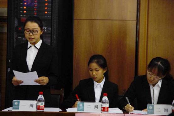 法学院讯(通讯员邓娜 摄影刘佳静)11月9日下午,我院第七届律政杯辩论赛决赛暨闭幕式在8611模拟法庭顺利举行。出席本次辩论赛的有刘元璋老师、团委书记兼18级辅导员恽力达,校辩论队文学院优秀辩手黄雪纯、张唯,校辩论队法学院优秀辩手熊菲、肖肖。2017级朱沁雯担任主席。