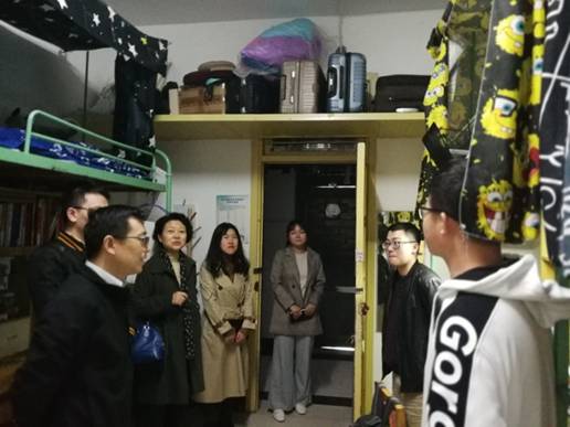 紧接着杨臣书记一行检查了学生寝室,认真查看了学生寝室的住宿环境,倾听同学们提出的问题,深入了解学生的生活情况和思想状态。杨书记还详细询问了同学们的生活、学习情况,小到灯光照明、床铺家具的摆设、校园网的质量,大到用电安全等情况,同学们都积极热情地回应。各位老师还就寝室同学间如何相处,如何养成正确生活习惯、如何营造积极健康的寝室文化等问题与同学们进行了交流。