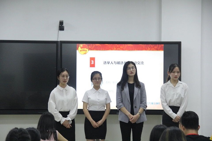 法学院讯(通讯员李欣 摄影饶淑华)5月27日晚,法学院第七届学生会主席团换届选举在八号楼举行。本次选举目的在于选出学生会主席团其余成员,包括三名副主席和一名秘书长,成员由第七届学生会主席张亭提名,黄杨、石微、靳媛成为副主席候选人,郭姝璇成为秘书长候选人。本次选举,依据我院在籍本科生一人一票原则,按年级分为四个选区进行民主投票。