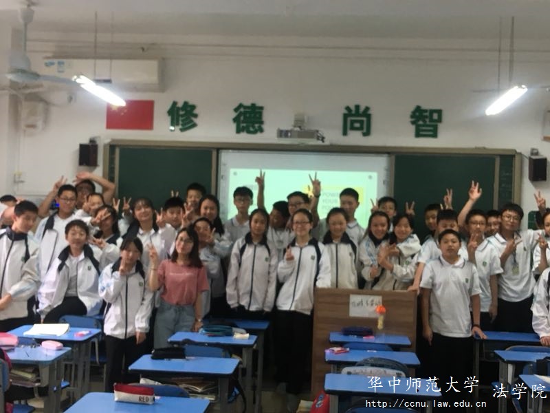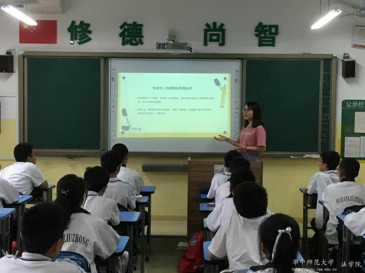 法学院讯 2018年5月4日下午,法学院普法教育研究生团队成员张国宁、蔡肖莹、王忱一行三人来到武汉六中上智中学进行普法教育活动。张国宁、蔡肖莹分别作为主讲人走进七年级十一班和十二班,开展以主题为“尊重和维护未成年人隐私权”的普法活动,旨在让广大青少年树立正确的法律观,增强其法治意识,维护自身合法权利。