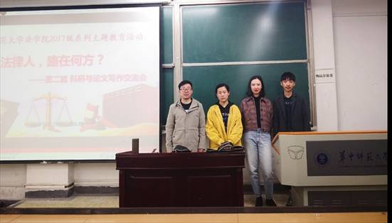 法学院讯(通讯员 孔昕曈)11月17日晚6点,我院本科2017级“法律人,路在何方”系列主题教育第二篇“科研与论文写作交流会”在8511教室顺利举行。本次活动由辅导员张立波主持,2016级刘景琪、刘浩田、熊予晴三位同学主讲,2017级全体学生参加。