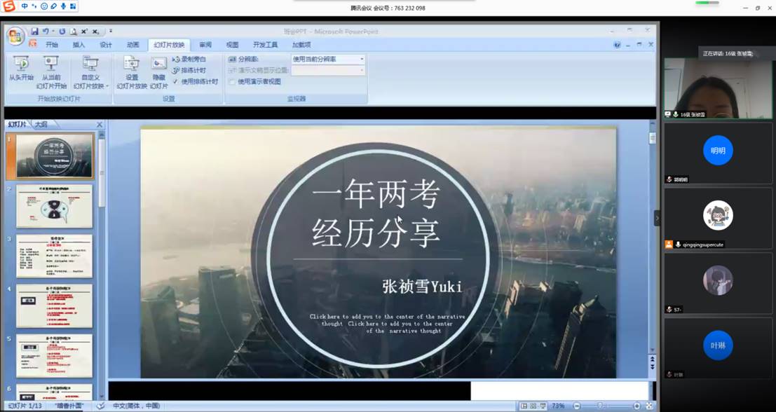 接着张欣钰同学为大家讲述了自己考研的心路历程。她表示适合自己的方法才是最好的方法。在备考期间,为了克服拖延与懒惰,她强迫自己列计划,并定了多个闹钟提醒自己按时打卡。抓住一切碎片时间进行复习。“选对了方向,准备充分,不到最后一刻不放弃”,这是张欣钰考研成功的关键。最后,她引用了姚誉作老师的“能量守恒定律”,希望同学们能专注于自己所拥有的,不纠结不后悔,并表示愿意贡献一丝自己的光和热,欢迎大家找她交流和倾诉。