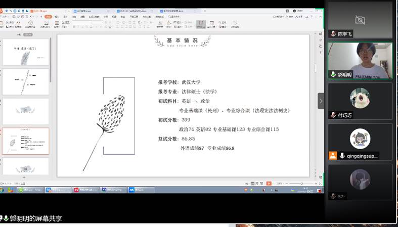 郭明明从法硕考研的角度分享了自己的考研故事。她简单介绍了武大法硕的面试情况,从正反两个方面总结经验教训,并建议大家背诵尽可能全面,尽早准备复试。
