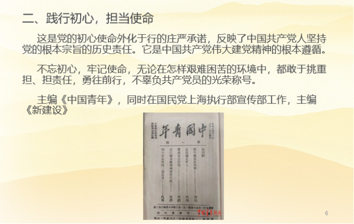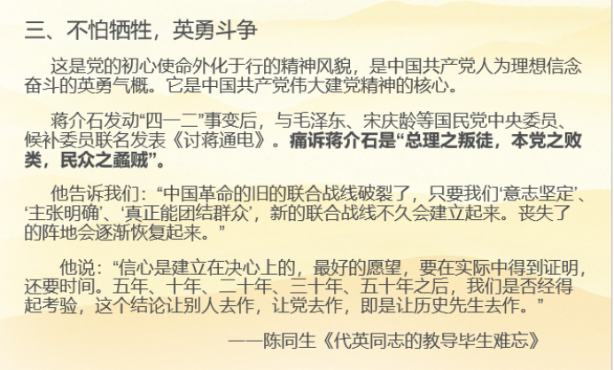 不怕牺牲,英勇斗争。这是中国共产党人为理想信念奋斗的英勇气概,是伟大建党精神的核心。李良明教授强调,恽代英忠诚于孙中山、三民主义和党,始终践行党高于一切的思想,维护党的统治。他对蒋介石背叛党的行为深痛欲绝,坚决与一切反对党的行为做斗争。他参加了南昌起义、广州起义,始终奋战于党的第一线。他的一生是为初心英勇奋斗、不怕牺牲的真实写照。