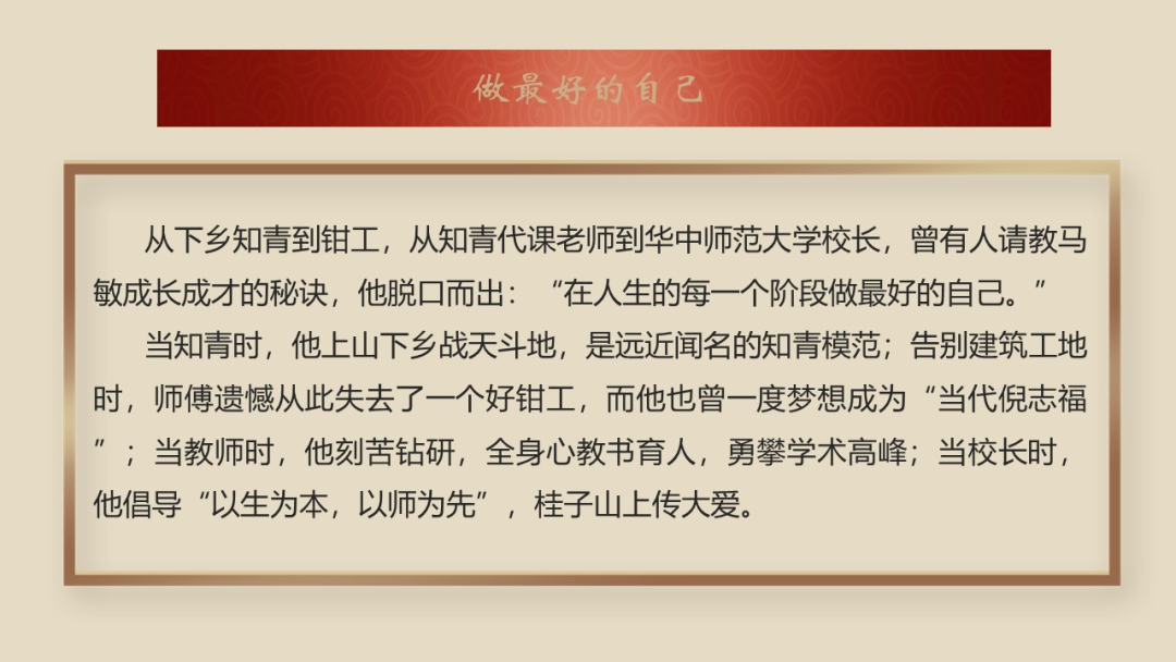 杨臣以华师故事为切入口,依次讲述了华中师范大学著名校友恽代英的故事与理想追求、校友伍正华与《信仰的味道》的故事,华中师范大学原校长马敏教授一步步成长成才的故事。通过三个故事,希望同学们理解坚定理想信念的重要意义,勉励大家要以三个故事主人公为榜样,从他们身上汲取精神力量,在奋斗中实现自己的人生价值,达到个人价值与社会价值的统一,把个人理想融入党和国家的发展事业中,以更昂扬的精神风貌迎接党的二十大胜利召开。