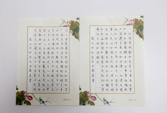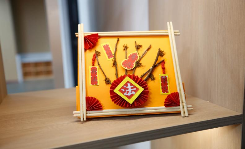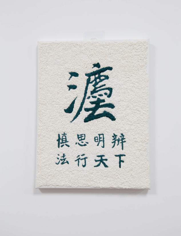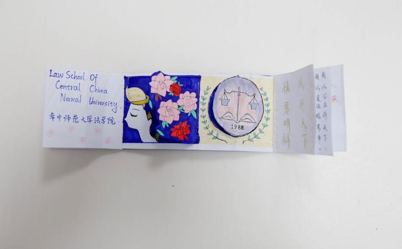 本作品以纸浆为原料,由周吴霜和赵敏共同完成,由赵敏负责文字书写,周吴霜负责材料准备,共同完成扎纸工序。本作品以“灋”和法学院院训“慎思明辨,法行天下”为要素,简洁明了地体现了法学院求知的精神。