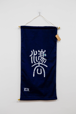 本作品采用非物质文化遗产蓝染蜡染的工艺,以蓝白两色为主调,通过构图、封蜡、染色、脱蜡、漂洗等步骤完成创作。壁挂中间的文字是小篆形体的“法”,平之如水,触不直者去之。将院徽置于“法”中,展现法学院师生的专业理念与信仰追求。左下角为华中师范大学120周年校庆标识,学在华师法学院,爱在我是华师人。