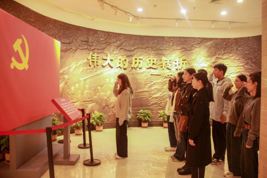 参观结束后,全体共产党员面向鲜红的党旗,举起右拳,重温入党誓词,牢记初心使命。