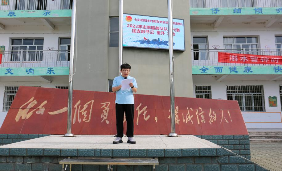 董升作为老队员代表发言,他回顾了去年进行支教活动的经历,勉励今年志愿队的队员们努力成为学生们成长路上的良师益友。林彦晨代表所有队员表示在活动期间要秉承“忠诚博雅、朴实刚毅”的华师精神,牢记“慎思明辨、法行天下”的院训,以勤恳扎实的态度完成本次志愿服务活动。
