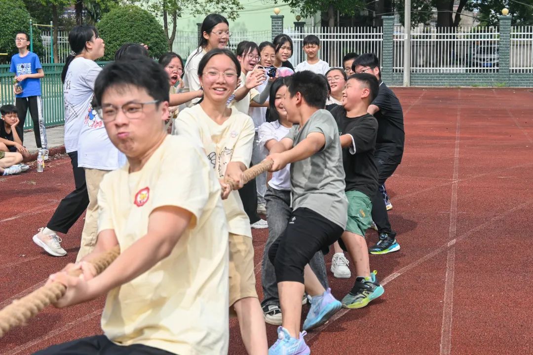 现场氛围热烈而融洽。学生们在雷区取水项目中集思广益,通过团队配合,齐心协力完成团体任务;拔河赛场上,学生们每一次拉锯都是对毅力的考验,每一次挺进都是团队精神的彰显;接力投篮项目中,学生们以精湛的投篮技术和默契的团队配合,取得了优异的成绩……比赛过程中,呐喊声不绝于耳,赛场上,小运动员们团结拼搏、力争上游,场面紧张有序,妙趣横生,彰显着少年们无限的活力;赛场下,啦啦队热情不减,整齐划一的呐喊声和加油声回响在整个运动场,展现出良好的团队协作意识和集体主义精神,彰显着资市中学学子的精气神。