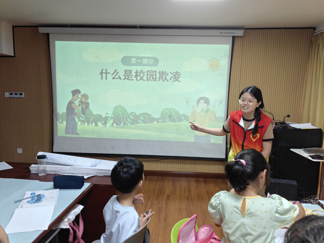 依法守护,童年无忧。实践团成员唐熠名进行题为“拒绝校园欺凌,童年与法同行”的授课,从法律的角度围绕“什么是校园欺凌”“校园欺凌的主要表现行为”“如何应对校园欺凌”等方面,并通过案例故事的形式深入浅出地讲解校园欺凌带来的法律后果,并向孩子们“支招”:一是安全第一,预防为主;二是应对暴力,临危不乱;三是及时报告,以法维权;四是强化守法意识,提升自我保护能力;五是掌握维权技能,积极捍卫自身权益。课堂上,孩子们认真聆听,与老师积极互动,主动分享自己的想法,并表示以后要更加注意自己的言行,也会勇敢地对欺凌行为说“不!”