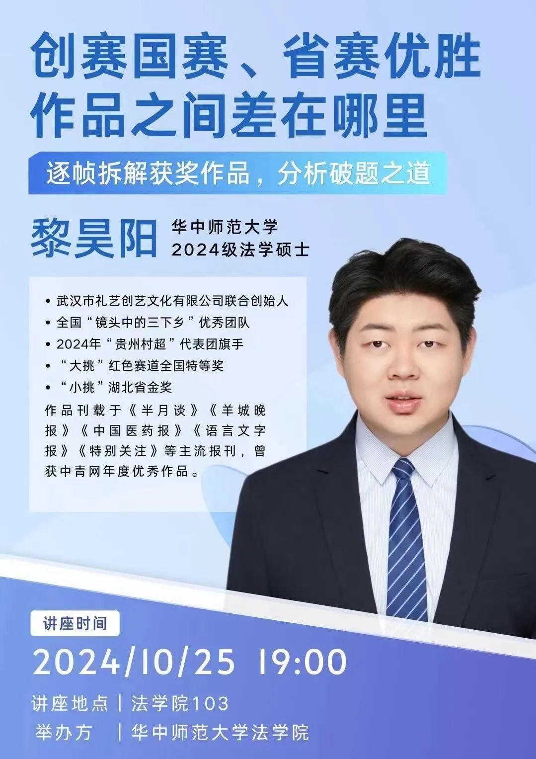 10月25日,华中师范大学2024级法学硕士、武汉市礼艺创艺文化有限公司联合创始人黎昊阳在法学院103教室做创新创业项目经验分享。学院团委副书记何青苗出席会议,法学院本科生、研究生共计70余人参与。