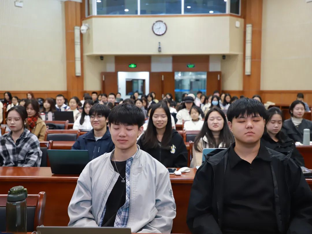 讲座伊始,张老师以自身当前面临的压力为切入点,巧妙引出了讲座的主题。随后,他深入浅出地向同学们阐述了“压力与情绪产生的内在机制”,即探究了这些心理状态形成的根源。通过多角度的分析,同学们深刻意识到,情绪的产生可能源于个体差异,如对自我期望过高,或是难以驾驭的外部环境等多重复杂因素。张老师着重分享了若干实用的压力与情绪管理方法,涵盖了合理情绪宣泄、注意力转移、积极寻求社会支持以及适度体育锻炼等方面。此外,他还亲自引导同学们在宁静的氛围中进行放松练习。全场学生在张老师的带领下,缓缓调整呼吸,让身心逐渐放松,共同探索个人最佳放松状态。