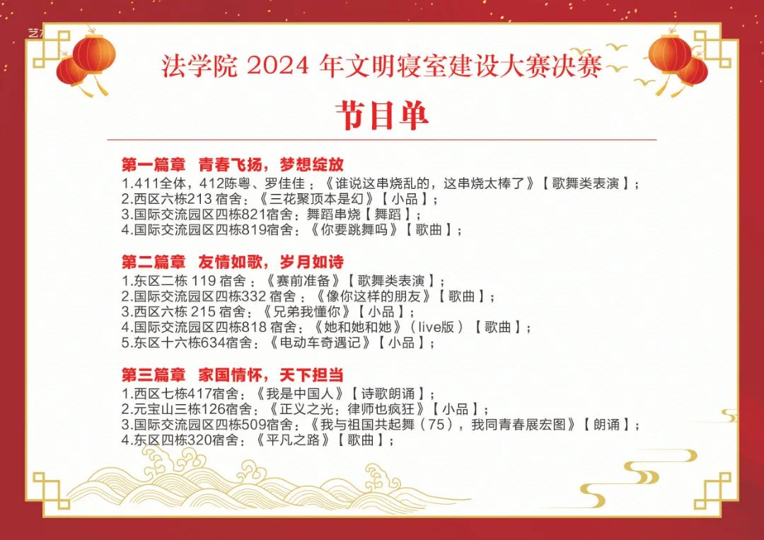 随着法学院2024年文明寝室大赛决赛的圆满落幕,每一个精彩瞬间都定格成了青春记忆中闪耀的篇章。挺膺担当谱青春,同心筑梦“寓”未来,此次大赛不仅展示了法苑学子们的多才多艺与深厚情谊,更激发了大家对文明寝室、和谐校园建设的无限热情。让我们携手并进,在未来的日子里继续发扬团结友爱、积极向上的精神,共同书写属于我们的青春华章,向着更加辉煌的明天迈进。