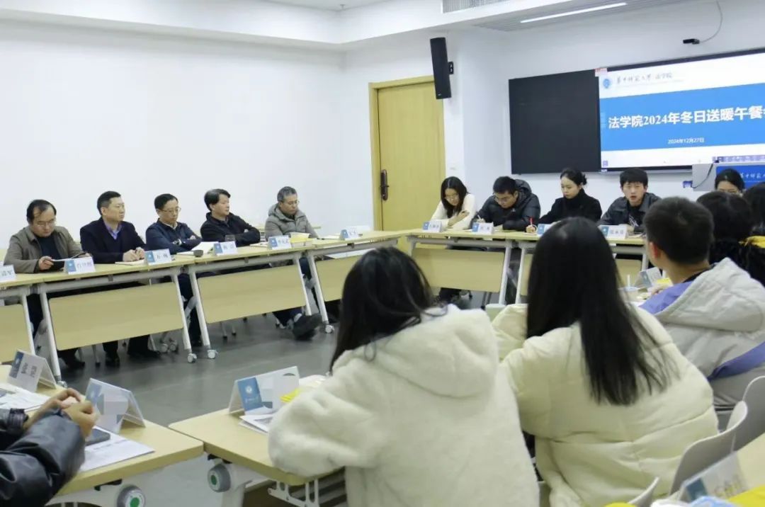 12月27日中午,法学院“冬日送暖”座谈交流会在学院101教室举行,法学院党委书记杨臣,党委副书记万枞,副院长文杰、肖登辉,院长助理王清军,研究生导师代表李克武、曹奕阳、罗世龙,本科生班主任代表孙思雨、聂圣、周林、张罡,辅导员张永基、姜孝文、何青苗、陈志超、焦修齐、张龙及本研学生代表参会。会议由万枞主持。