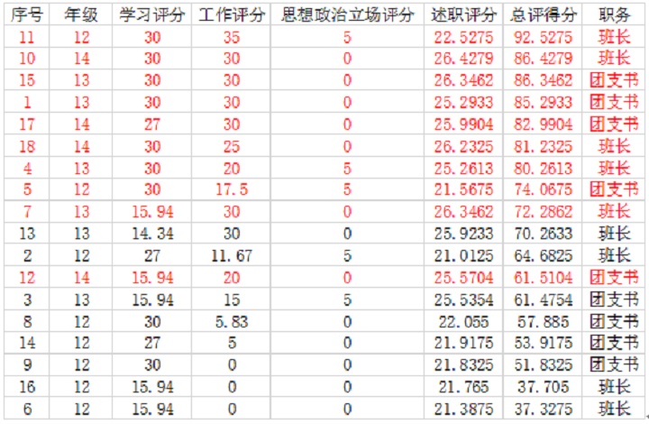 参评人员的总分由学习、工作、思想政治立场和述职四部分得分相加而成。学习评分依据为平均学分绩专业排名,工作评分依据为所在班团及个人的获奖情况,述职评分依据为述职大会评委评分的平均值,思想政治立场评分依据为政治面貌(党员/预备党员加5分)。总分满分100分,四项满分根据各年级情况进行不同的分配,13、14级各项满分分别为30分、30分、5分、35分,12级各项满分分别为30分、35分、5分、30分。最终根据总分的高低分别评选出五位优秀班长和五位优秀团支书。
