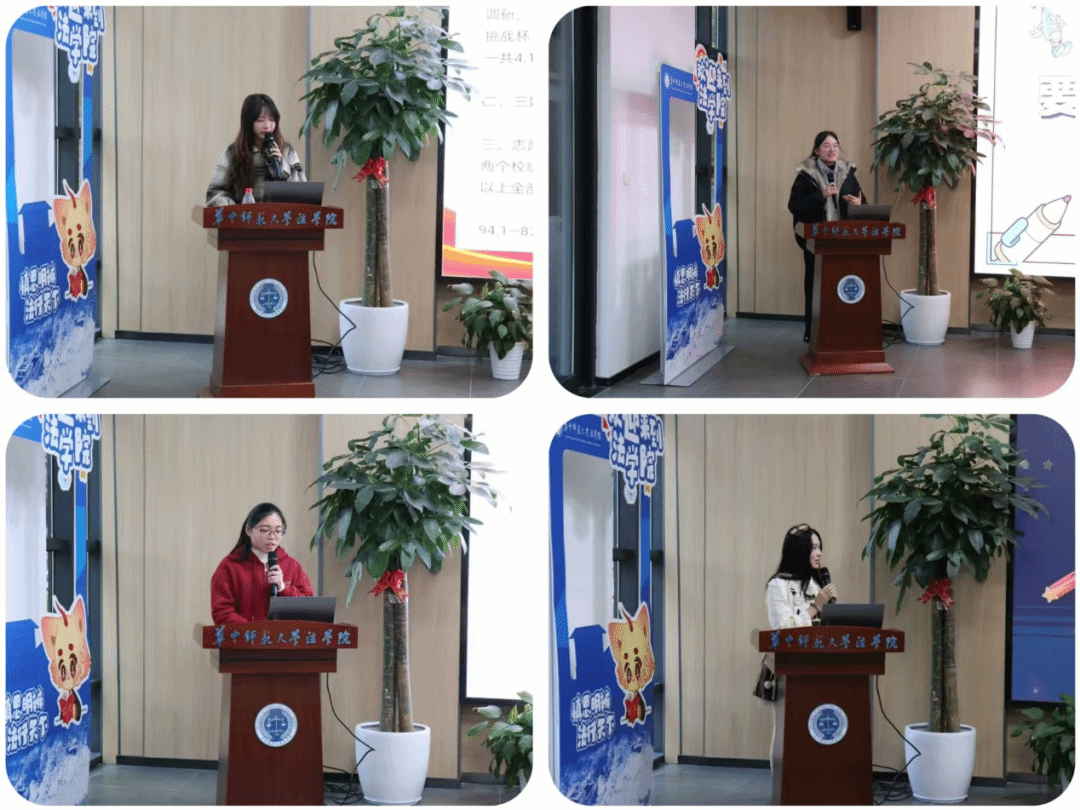 11月30日下午,国奖获得者成长经验分享会在法学院一楼大厅顺利举行。分享会由法学院学科部潘裕榕主持。活动中,胡欣洁、刘婧蕾、朱珊和钟文芳四位国奖获得者,结合自身求学经历,从学业规划、高效学习方法、实践探索等维度分享心得,同时勉励在场同学正视自身价值、坚定理想信念、持续奋勇前行,在青春赛道上凝聚光华、绽放风采。