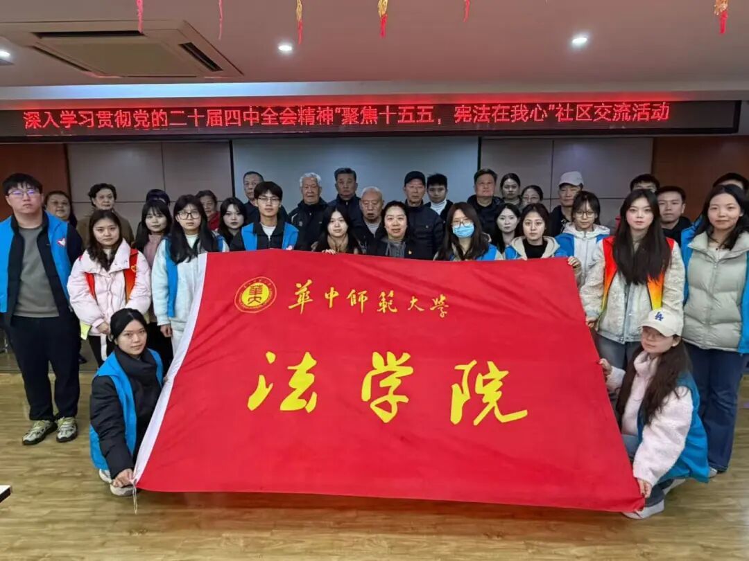 12月5日下午,华中师范大学法学院本研团总支社会实践部、青年志愿者协会联合法律硕士(法学)第一、第二党支部代表和学生志愿者,在洪山区银海雅苑社区举办“聚焦十五五,宪法在我心”社区交流活动,法学院的学生党员与社区党员、居民代表齐聚一堂,共学政策精神,共话社区发展。