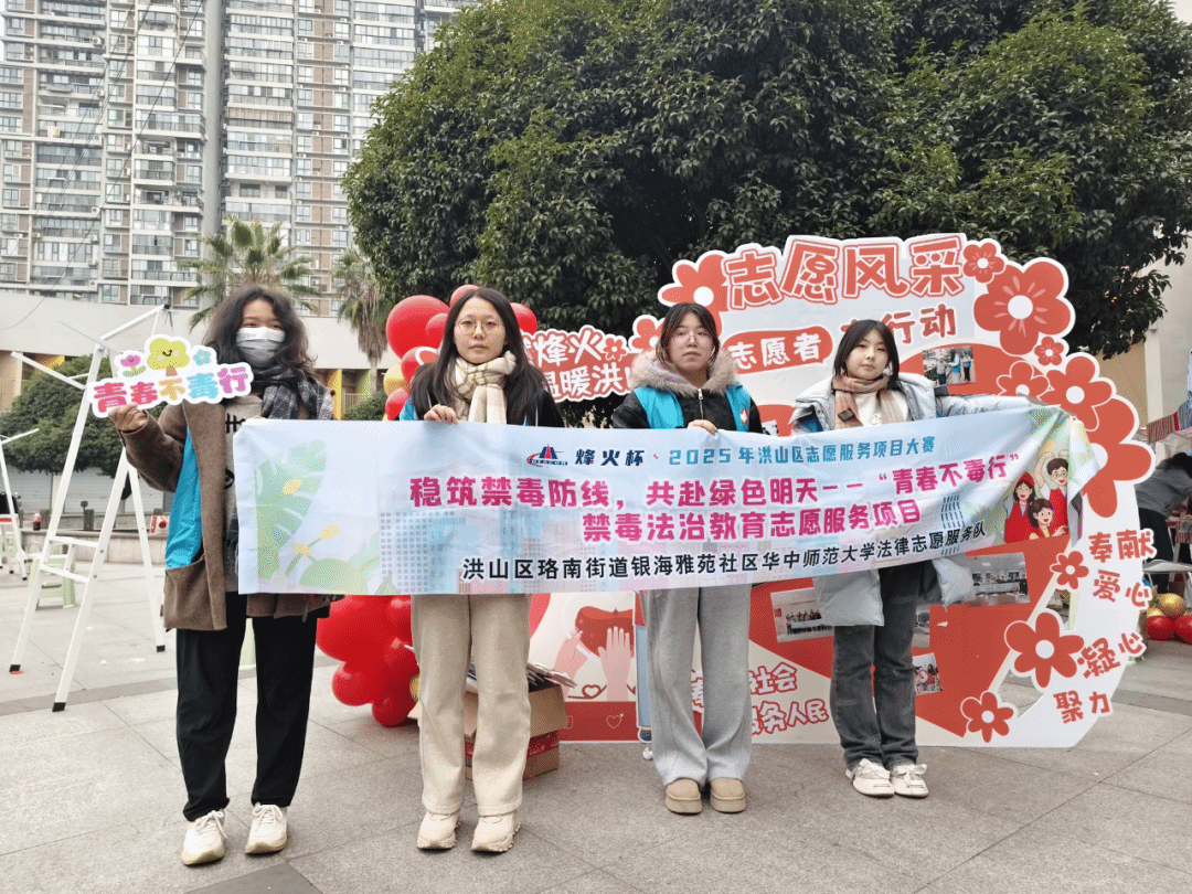 12月4日,“青春不毒行”禁毒法治教育志愿服务队前往东湖社区党群服务中心,参与2025年洪山区“烽火杯”志愿服务项目大赛成果展示与公益集市活动。活动中,李雨恬同学系统汇报了“青春不毒行”团队的建设进展与宣传成效。现场还播放了由学生自编自演的禁毒情景剧,生动揭示新型毒品的伪装与危害,提升公众尤其是青少年的识毒、防毒能力。场外的公益集市同样气氛热烈,队员们通过讲解禁毒知识、义卖主题文创等方式,传递健康生活理念。