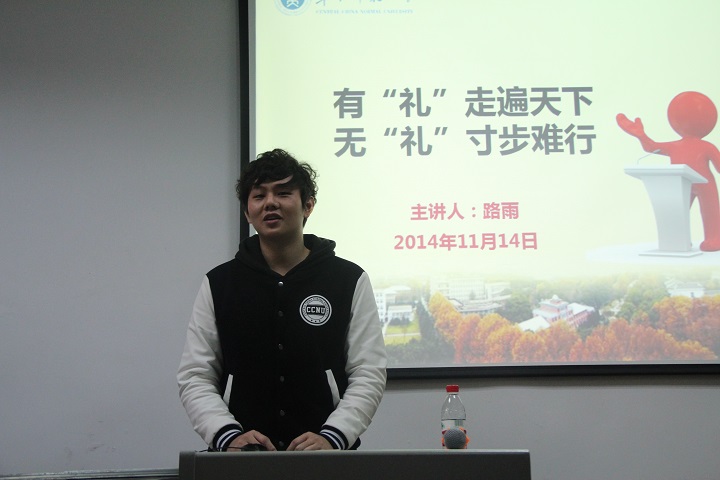 宣读完团干培训管理条例,本年度团干培训正式开始。路雨就社交礼仪这一主题开始了第一堂课前半部分的讲授。他以学生会干部应该具备哪些素质与能力这一问题为引,依次展开语言礼仪、行为礼仪、日常礼仪的论述,提出人际交往要注意不同场合,坚持实事求是,言辞谨慎,和蔼大方。在授课期间,他还多次与在座学生互动,进行场景模拟,如当面向老师递交邀请函,电话邀请老师参加院系活动等,让同学们在轻松活泼的氛围中,切身体会礼仪,运用礼仪。最后他回归学生会本身,总结出学生干部该注意的工作方式,并以自己总结出的“四一”,即将自己的工作视为“一项事业”“一门学问”“一个天地”“一种生活”结束了本次授课。