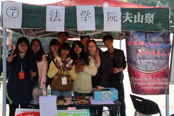 法学院讯(通讯员刘燕摄影覃晶晶)12月6日上午9:30,华中师范大学青年志愿者联合协会20周年暨志愿者文化嘉年华在喷泉广场拉开帷幕,此次嘉年华的主题是“爱满华师·情暖江城”。参加活动的有22个院系以及8大爱心社团,法学院凭借自身独特的魅力,荣获“活动关注度排行榜”第七的佳绩。
