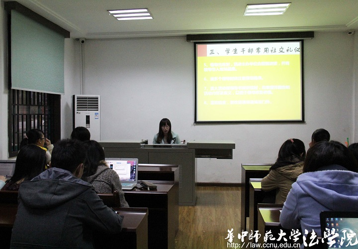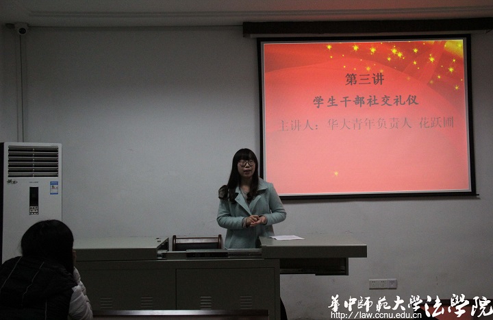 法学院讯(通讯员刘梦洁 摄影李静)11月22日下午,我院2015年团干培训第三节课(选修)在法学院104多媒体教室开讲,这次的主讲人是来自法学院13级的花跃圃,为同学们讲授学生干部的社交礼仪。