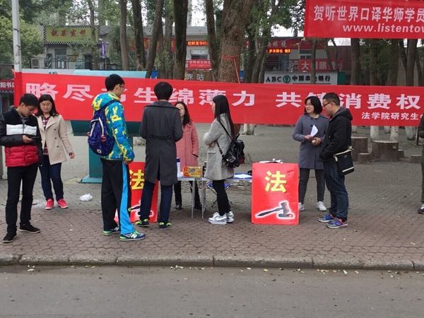 法学院讯( 通讯员朱彦南)3月15日,“法在身边”—法制宣传月系列活动之3.15普法宣传活动在学子餐厅门口举办场。本次活动以“略尽书生绵薄力,共筑消费权益城”为主题,以发放宣传单页的形式走进学生群体,取得了很好的法制宣传效果。
