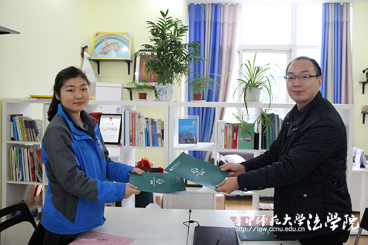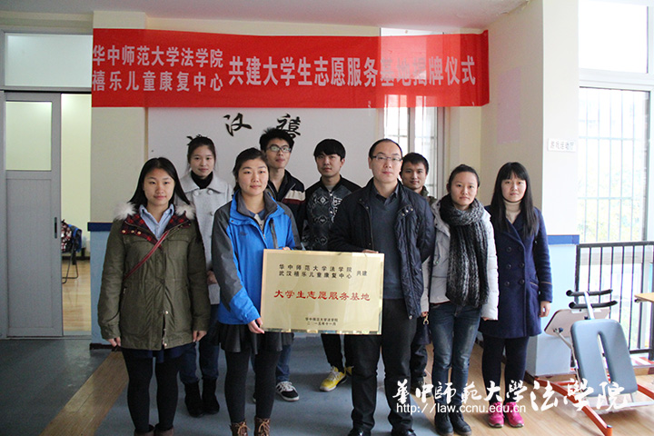 经过洽谈,武汉禧乐儿童康复中心负责人于老师和张德华共同签署了建立大学生志愿服务基地的合约,法学院也向武汉禧乐儿童康复中心捐赠了图书等学习用品。最后,双方的负责人和禧乐爱心服务队队员共同为基地揭牌并合影留念。