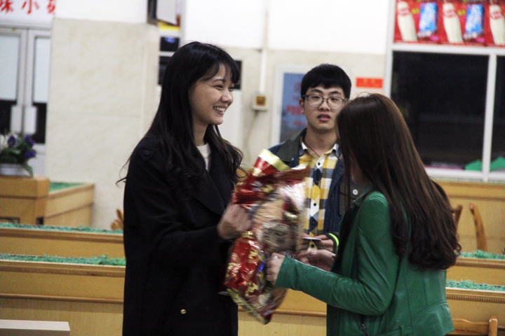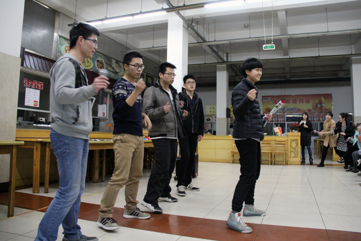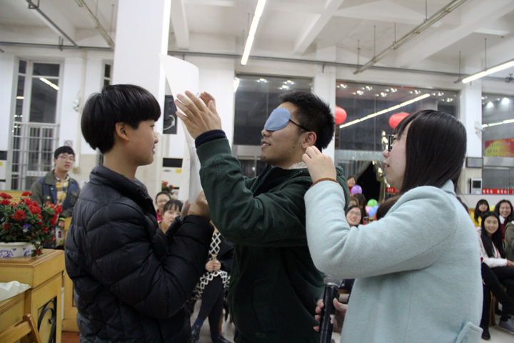 晚上八点,主持人王奎国、向宇宣布活动开始。为活跃现场气氛,首先进行的是第一轮抽奖,送出了本场三等奖的礼品。随后进行的是男女生互动游戏“盲人摸象”,男女一方将眼睛蒙上,在另一方的指挥下将手中的“王”与前方扮“象”的同学手中举着的虎头上的“王”字贴合,考验男女默契配合。尽管扮“象”的同学不断改变位置,但每组同学都能在在搭档的指挥下,将“王”字贴好,获得精美礼物。