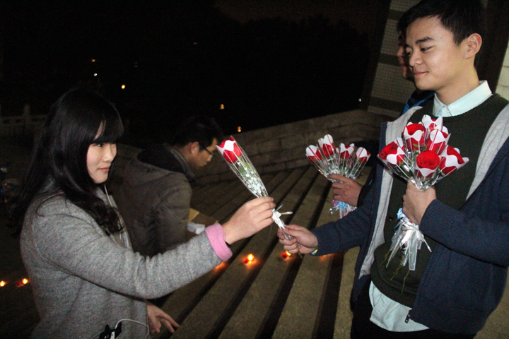 最后,在主持人和男生们的祝福声中,今年的法学院女生节特别活动告一段落。有女生表示:“走在进现场的那条路上就觉得很浪漫,玫瑰蜡烛配巧克力这种集体祝福让人觉得很有归属感。”