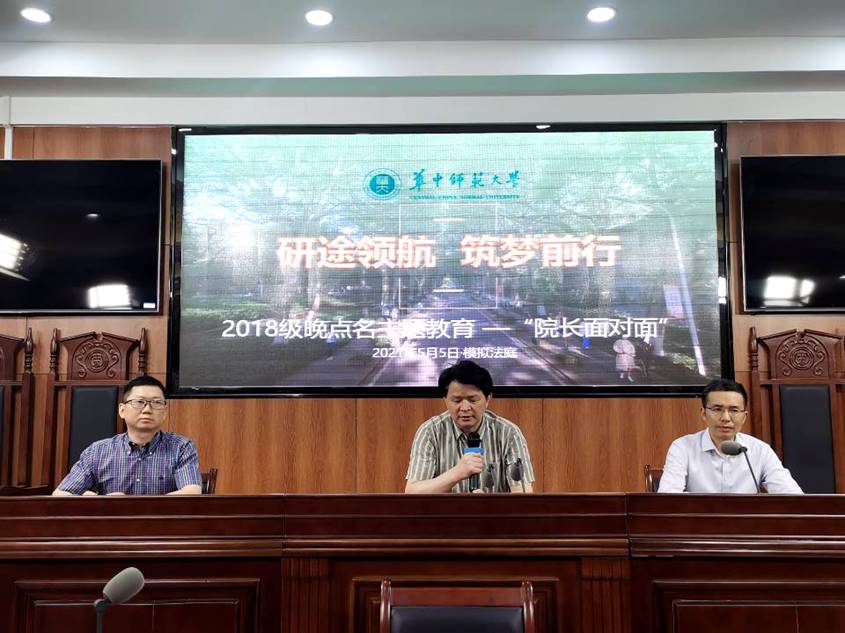 5月5日晚,华中师范大学法学院本科2018级全体同学在8611教室进行晚点名,本次晚点名采用“院长面对面”师生问答的形式进行,法学院院长李克武、党委副书记万枞、法硕中心主任文杰、2018级辅导员恽力达参加本次活动。