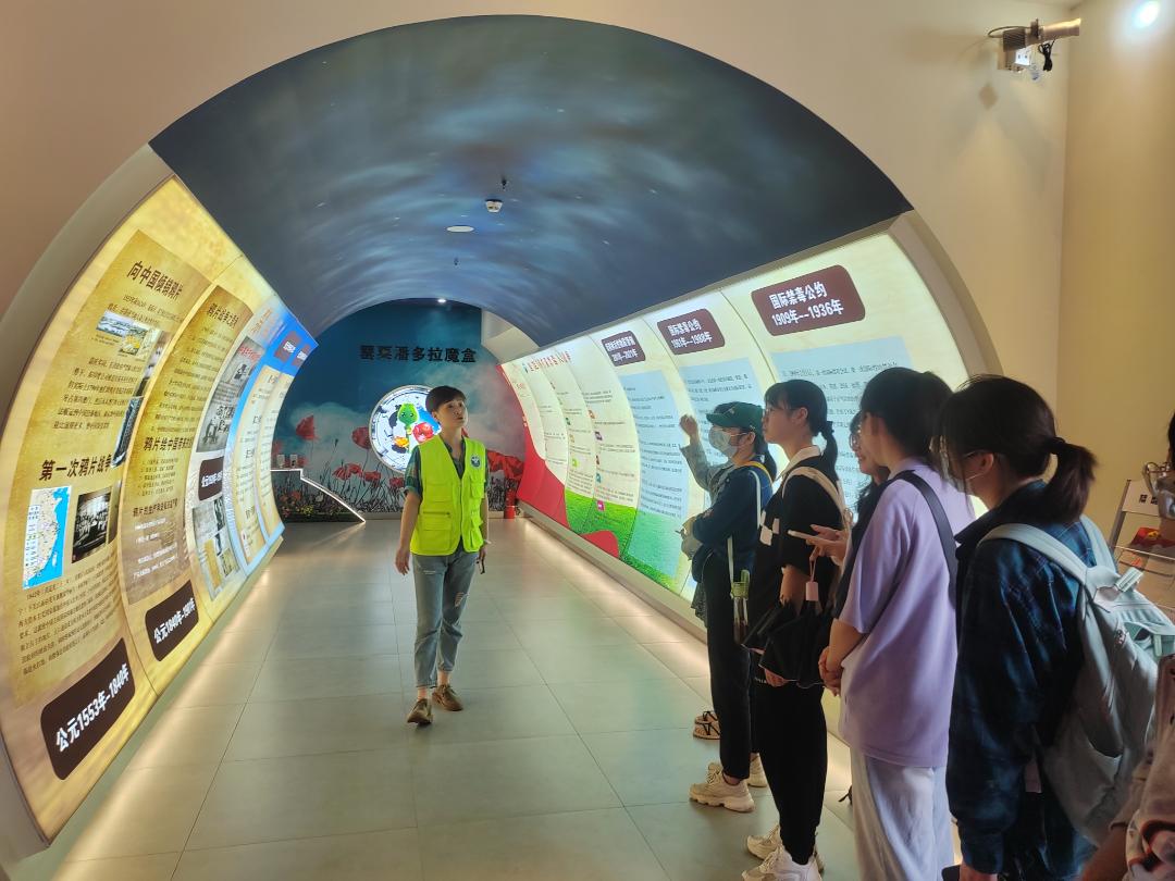 讲解员带领同学们参观禁毒展览馆,她以虎门硝烟这一历史事件引入,向大家介绍了中国百年禁毒史以及我国禁毒工作相关的法律制定和完善过程。同学们对禁毒简史、禁毒公约、禁毒里程碑等禁毒知识有了更多了解,也深刻认识到禁毒工作是一场持久战。