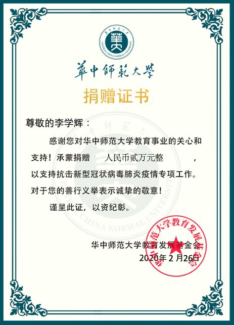 校友李学辉律师向我院捐赠两万元人民币,作为我院抗击疫情的专项经费,用于资助困难学生。李学辉律师是我院2003级民商法学硕士,现为北京安理律师事务所合伙人,是最高人民法院诉讼咨询监督员、北京市人民政府立法工作法律专家委员会委员、中央和国家机关青年联合会委员,曾被评为首都十大杰出青年法学家(提名奖)、北京榜样.寻找律师楷模(提名奖)、华中师范大学建校110周年百名杰出校友等。