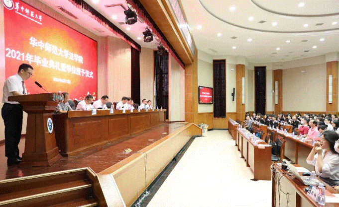 6月12日下午,法学院2021年毕业典礼暨学位授予仪式在科学会堂隆重举行。华中师范大学副校长任友洲,校友代表潜江市检察院党组书记、检察长周伟,法学院党委书记杨臣、院长李克武、副院长丁文、党委副书记万枞、法硕中心主任文杰、工会主席肖登辉、教师代表陈业宏、刘华、石先钰、胡伟、刘元璋、李寿廷、杨彩霞、程亚萍、杨涛、武小川、肖蓓、徐妮娜、王勤、吕琪,辅导员恽力达、胡羽、周蓓、张立波以及部分家长代表与学院2020届返校毕业生、2021届毕业生共同出席毕业典礼,分享毕业的喜悦,见证难忘的时刻。典礼由杨臣主持。