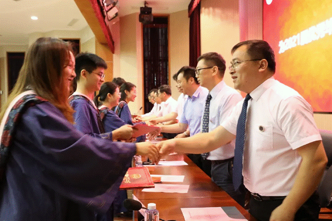 在表彰环节,万枞宣读了学院2021届优秀毕业生名单,全体领导和嘉宾为优秀毕业生代表颁发荣誉证书;肖登辉宣读了校友大使名单,感谢大家对校友工作的大力支持。