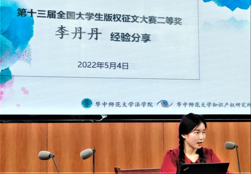 接下来,全国大学生版权征文二等奖获得者李丹丹同学在会议上分享了自己的论文写作经验。她讲述了自己写作的心路历程、前期准备工作、写作中遇到的困难以及如何在老师的帮助下克服困难修改完善论文的种种经验与收获。