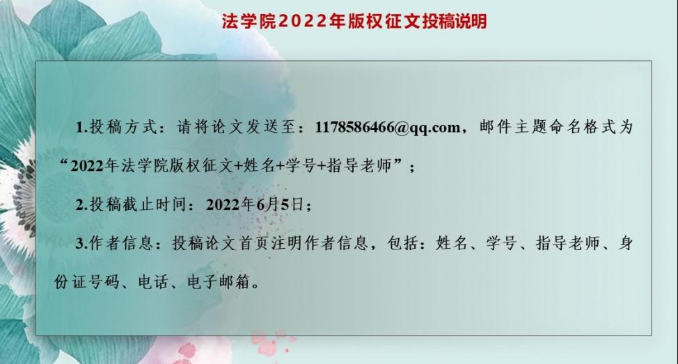 法学院举办年度版权征文活动,旨在深入学习与贯彻党中央、国务院关于知识产权工作的决策部署和习总书记对知识产权工作的重要指示,激发我院学生创新精神和创造能力,营造尊重知识、尊重版权的良好氛围,对接全国大学生版权征文活动。