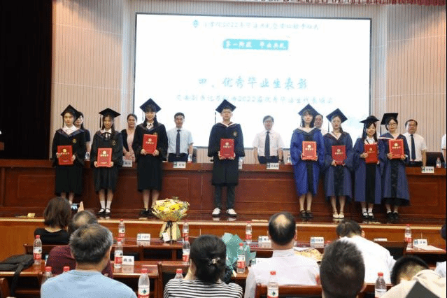 在授予学位环节,文杰和肖登辉分别宣读2022届博士、硕士学位授予名单和学士学位授予名单后,任友洲、李克武、丁文、文杰、肖登辉共同为毕业生拨穗并颁发学位证书。