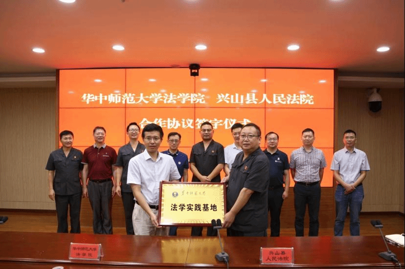 万枞和万里代表双方签署深度合作框架协议,文杰代表法学院向兴山县人民法院“法学实践基地”授牌。