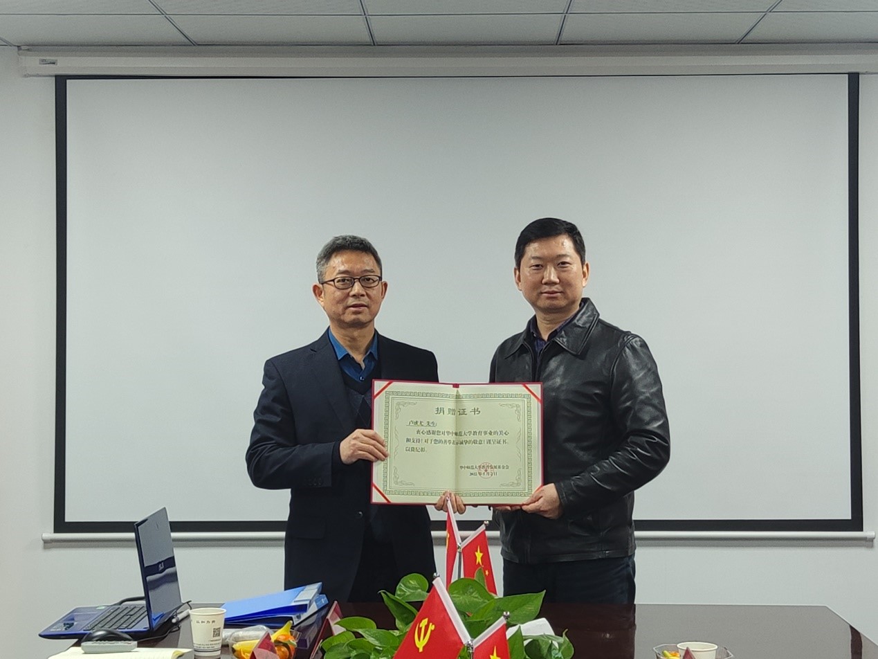 万枞代表华中师范大学教育发展基金会向卢成尤颁发荣誉证书和纪念品,感谢卢成尤2022年向华中师范大学教育发展基金会捐赠专项基金设立“星凯奖学金”,用于支持法学院人才培养工作。