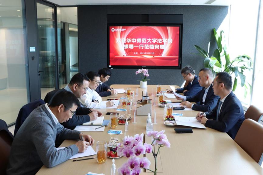 当天上午,杨臣、丁文一行赴安理律师事务所座谈交流。安理律师事务所党委书记、主任王清友,该所党委副书记、管委会委员、我院院友李学辉,该所管委会委员孟宪明热情接待了杨臣、丁文一行。在座谈会上,王清友主任首先对杨臣、丁文一行的来访表示热烈欢迎,他谈到,法治人才培养需要校企充分联动,希望以此次交流为契机,与华中师范大学法学院深度合作。李学辉律师是我院硕士毕业生,他向来访的领导们介绍了安理律师事务所的发展历程,并表达了发挥安理律师事务所的专业力量和平台优势助力母校法学院发展的决心。