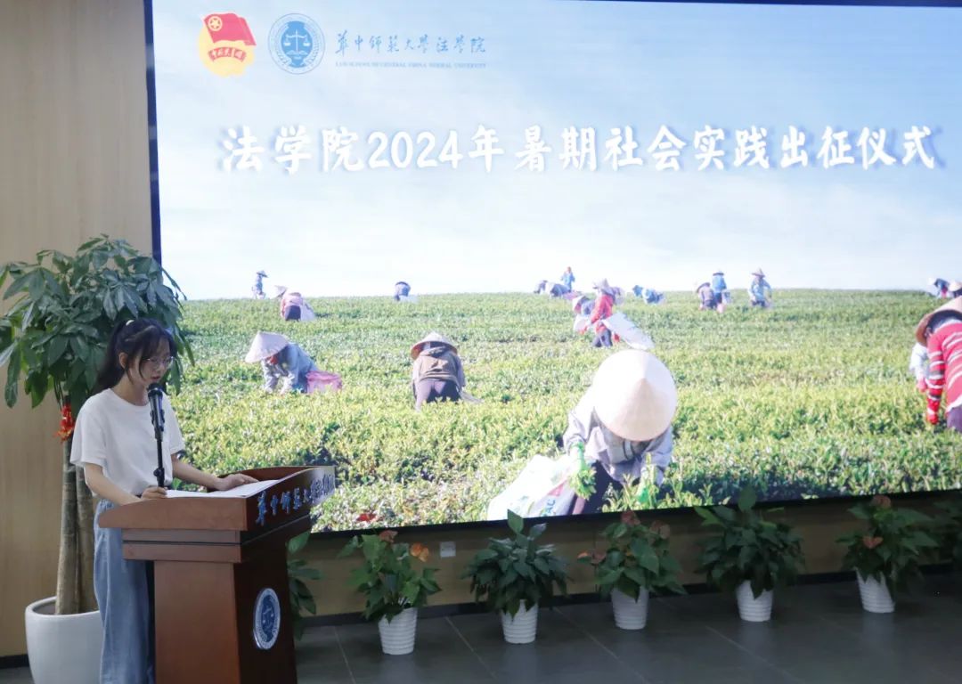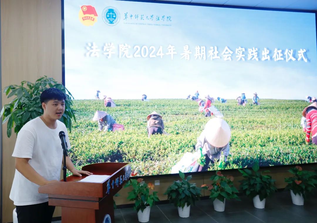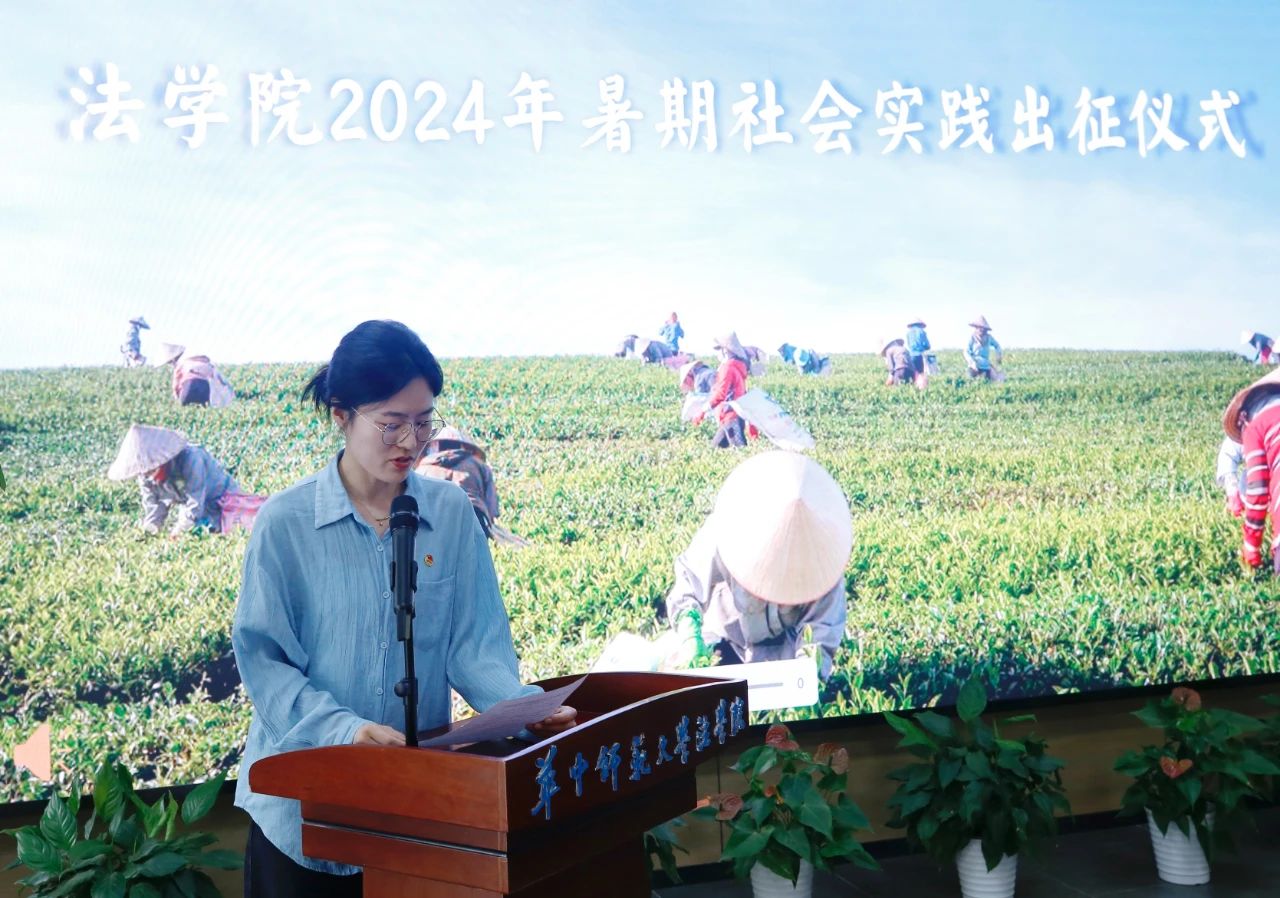 姜孝文宣读《关于成立华中师范大学法学院2024年社会实践团队若干临时团支部的决定》。她要求实践队伍在保证安全前提下把思想政治教育和法治宣传教育同社会实践相结合,上好社会实践这一大思政课。