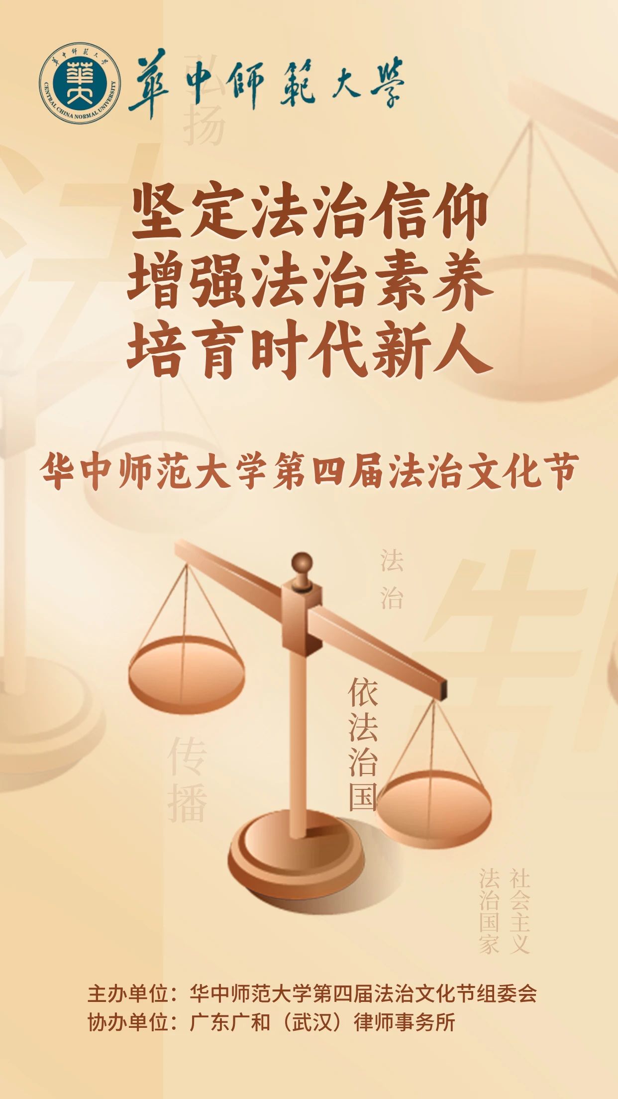 党的二十届三中全会指出,法治是中国式现代化的重要保障。必须全面贯彻实施宪法,维护宪法权威,要弘扬社会主义法治精神,维护社会公平正义,全面推进国家各方面工作法治化。为深入学习宣传贯彻党的二十届三中全会精神和习近平法治思想,弘扬法治精神,建设法治校园,营造法治文化氛围,增强师生尊法学法守法用法的自觉性和主动性,提升师生的法治意识和法治素养,打造华中师范大学法治教育品牌,学校举办第四届法治文化节。本届法治文化节的主题是“坚定法治信仰,增强法治素养,培育时代新人”,将面向全校师生开展近20场法治宣传教育活动,为全校师生奉上丰盛的法治教育大餐,期待全校师生的广泛参与。
